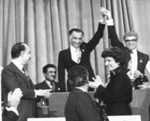 Minister for the Interior Jamshid Amouzegar, Minister of Higher Education Ghassem Motamedi, and Minister for Women’s Affairs Mahnaz Afkhami (center right) at Rastakhiz Party meeting.
