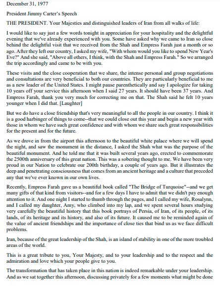 On New Year’s Eve, 1977, President Carter gave a speech: “Our talks have been priceless, our friendship is irreplaceable, and my own gratitude is to the Shah, who in his wisdom and with his experience has been so helpful to me, a new leader. We have no other nation on Earth who is closer to us in planning for our mutual military security. We have no other nation with whom we have closer consultation on regional problems that concern us both. And there is no leader with whom I have a deeper sense of personal gratitude and personal friendship.”